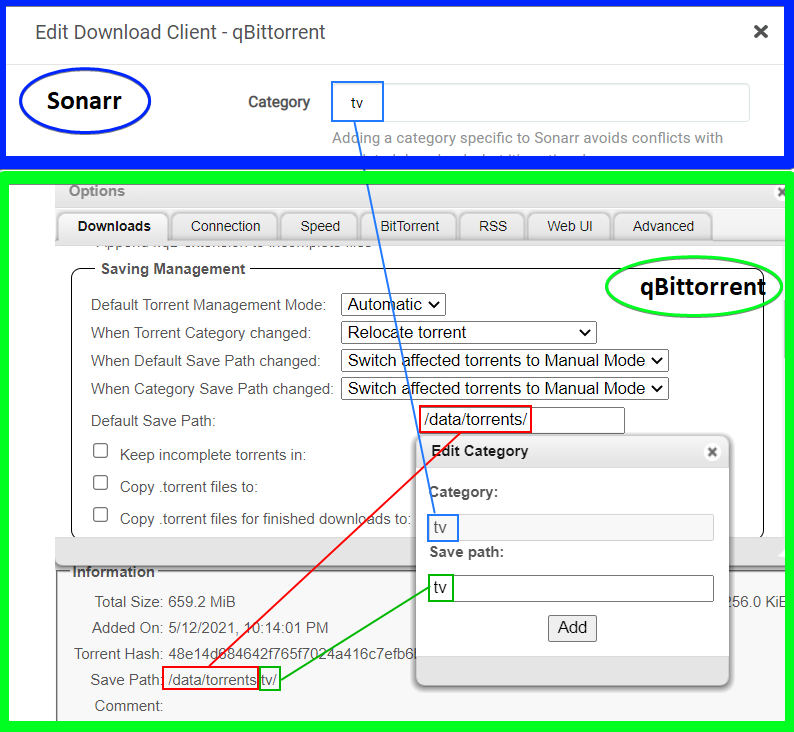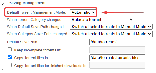 When your downloads end up in /data/torrents/ and not in /data/torrents/{tv|movies|music} then you probably forgot to change Default Torrent Management Mode: to Automatic