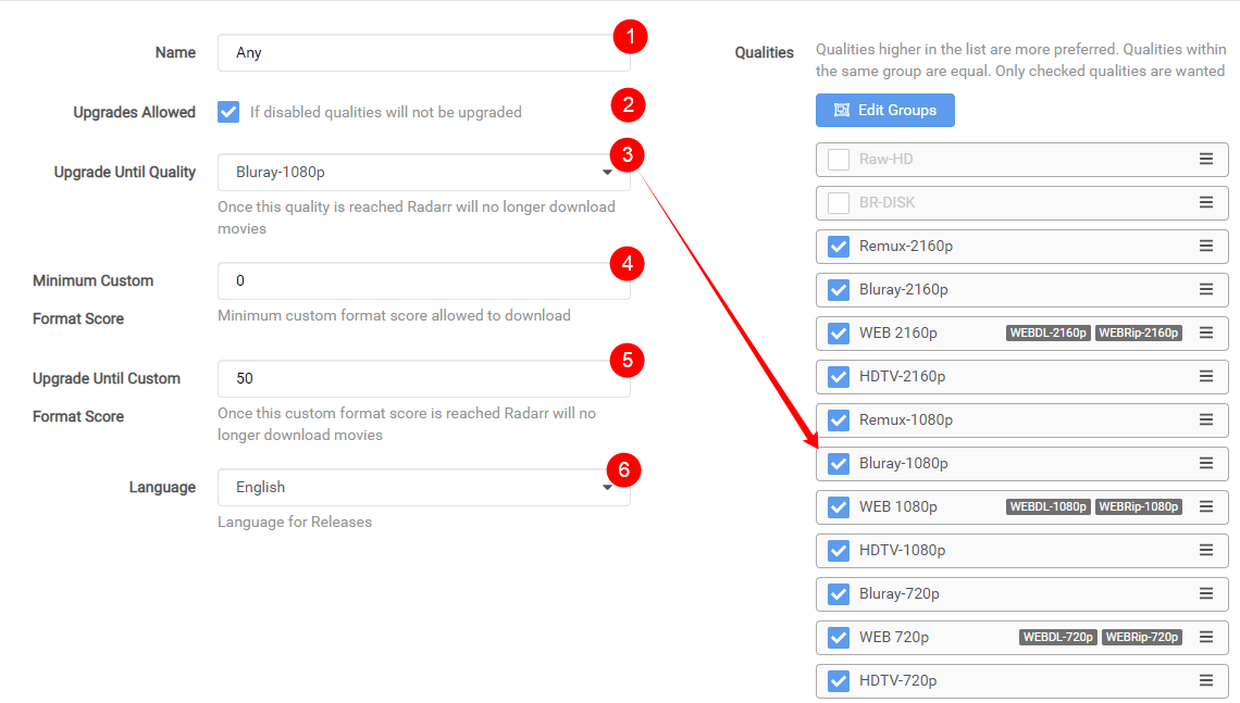 - Allow upgrades. Radarr will stop upgrading quality once (3) is met.