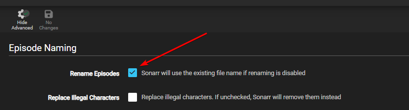 Another option is to use {Original Title} instead of the recommended naming scheme above. {Original Title} uses the title of the release, which includes all the information from the release itself. The benefit of this naming scheme is that it prevents download loops that can happen during import when there's a mismatch between the release title and the file contents (for example, if the release title says DTS-ES but the contents are actually DTS). The downside is that you have less control over how the files are named.
